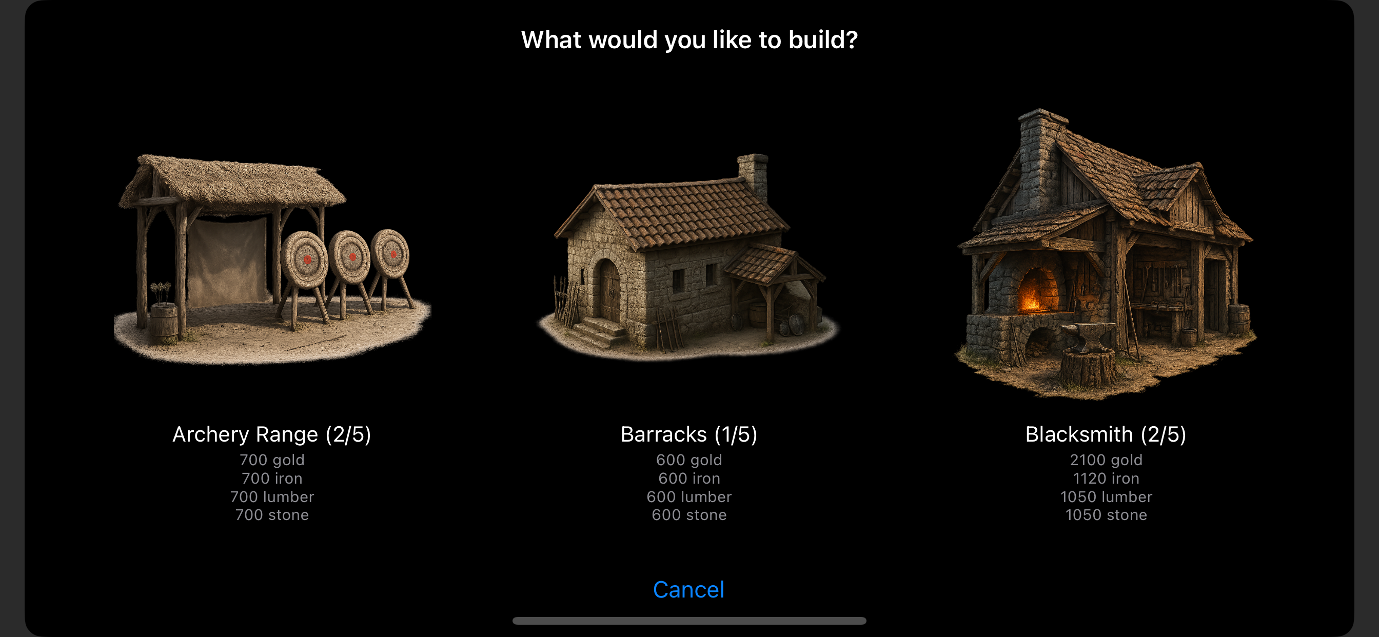 - Construct key buildings such as Barracks, Archery Ranges, Iron Mines, Lumber Camps, Stone Quarries, and more